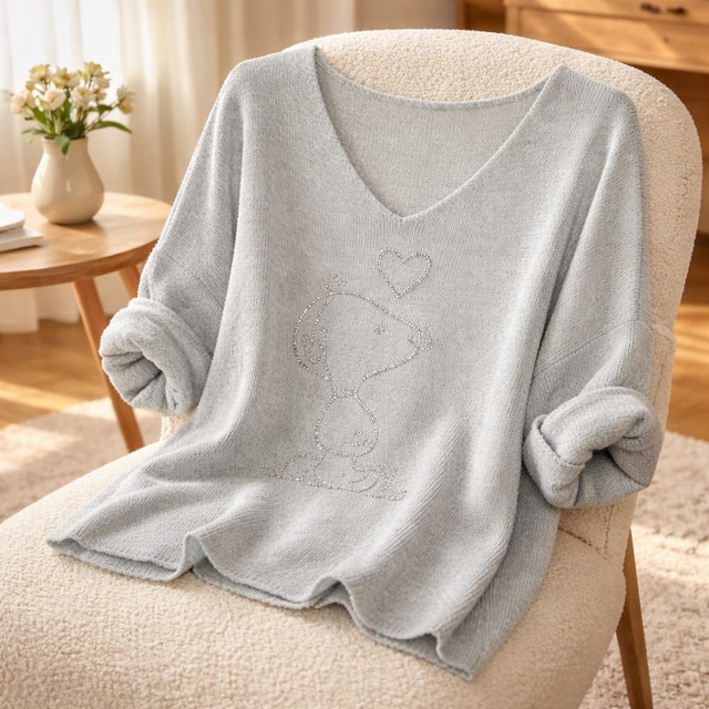 Dieser Chenyl Pullover "Snoopy" in hellem Beige zaubert verspielte Nostalgie und flauschigen Kuschelkomfort für gemütliche Tage. Der samtige Chenille-Effekt aus 50% Viskose, 25% Nylon, 25% Polyester liegt weich und formstabil an (AA 80cm, Länge 67cm). Perfekt zum Layern mit Jeans für retro-charmen Lifestyle-Momenten.