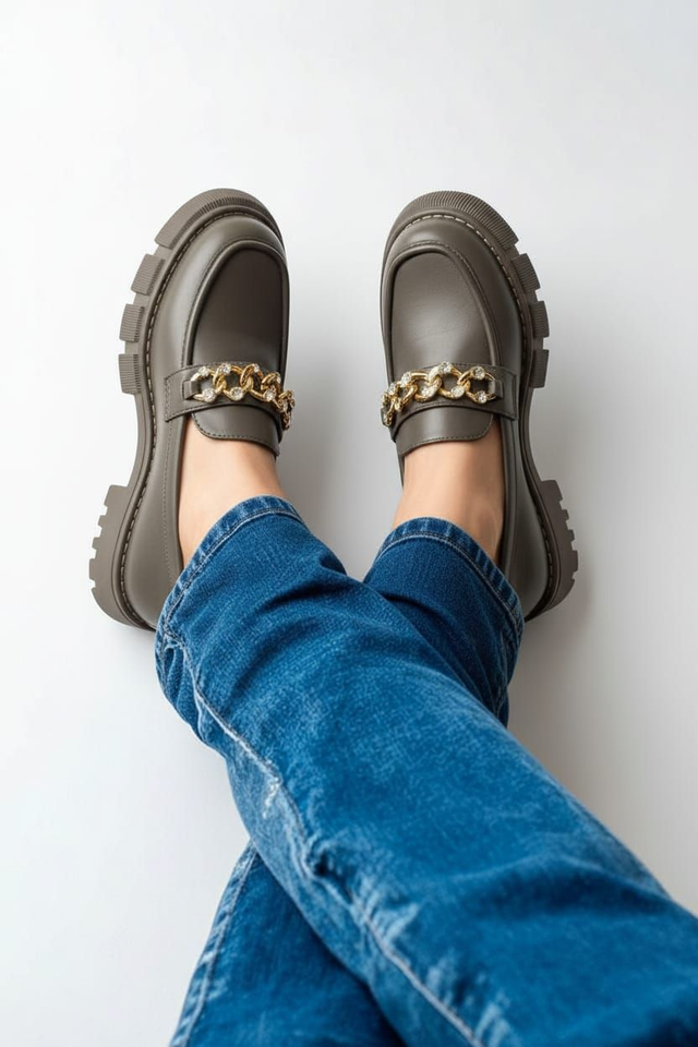 Diese stylishen grauen Loafer mit Plattform-Sohle und goldener Kette bringen urbanen Luxus in jeden Outfit. Die glatte Oberfläche und der chunky Absatz sorgen für bequemen Trend-Look. Ideal in Größe 41.