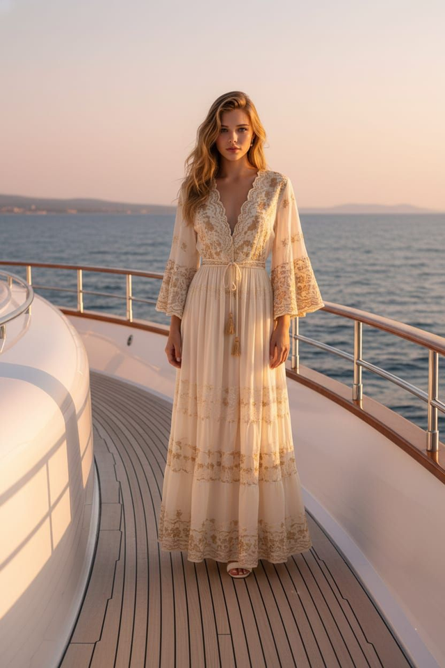 Dieses Maxi-Kleid in Creme mit goldener Spitze verkörpert luxuriöse Boho-Eleganz für traumhafte Sonnenuntergänge am Meer. Reine Baumwolle (100%, AA 55cm / Gr. 38-40/42, Länge 140cm) fällt weich und atmungsaktiv. Mit Gurt und V-Ausschnitt anpassbar für festliche oder entspannte Looks.