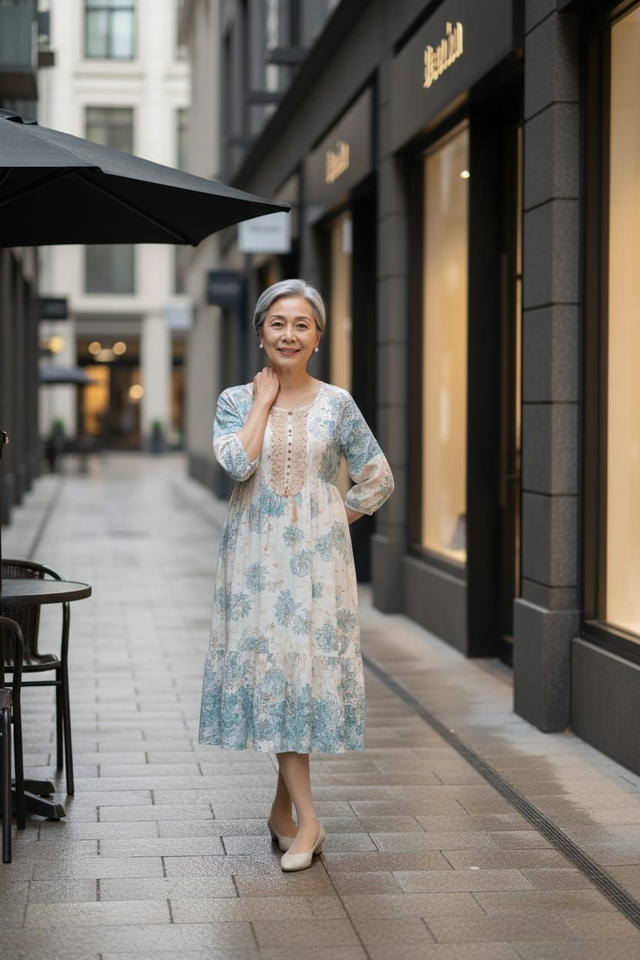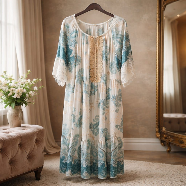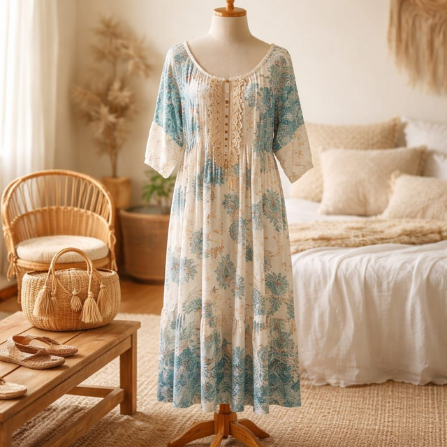 Dieses Maxikleid mit Blumenprint in Grau/Blau/Beige weckt boho-romantische Träume von Strandspaziergängen und Sonnenuntergängen. Der weiche Mix aus 85% Viskose und 15% Baumwolle (AA 60cm / Gr. 38-42/44, Länge 109cm) fließt luftig und atmungsaktiv. Vielseitig als Carmen-Ausschnitt durch Gummizug anpassbar – bei kleineren Staturen elegant lang, bei größeren figurbetont über dem Knie.