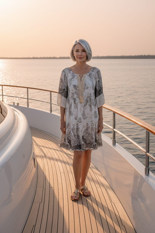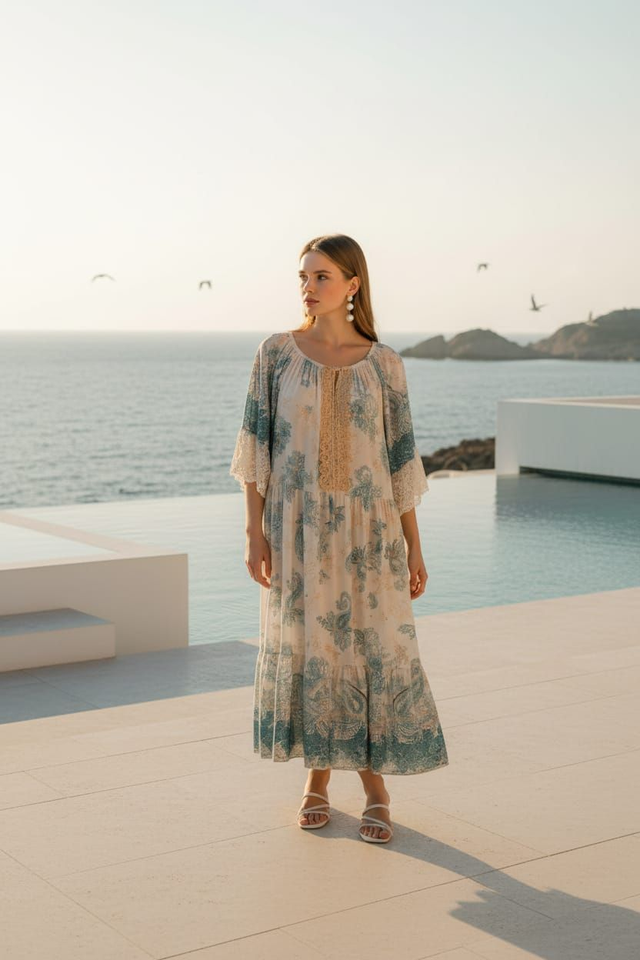 Floraler Ombré-Print und Fransen-Details als traumhafter Hingucker; mediterran verspielt.