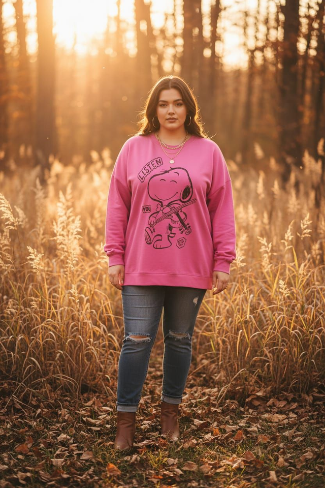 Front-Print zeigt Snoopy fröhlich mit Violine ("LISTEN YOU"), umgeben von schwarzer Outline; Rückseite mit Snoopy im Gras für doppelten Hingucker-Effekt. Cleanes Finish mit geradem Saum und langen Ärmeln.