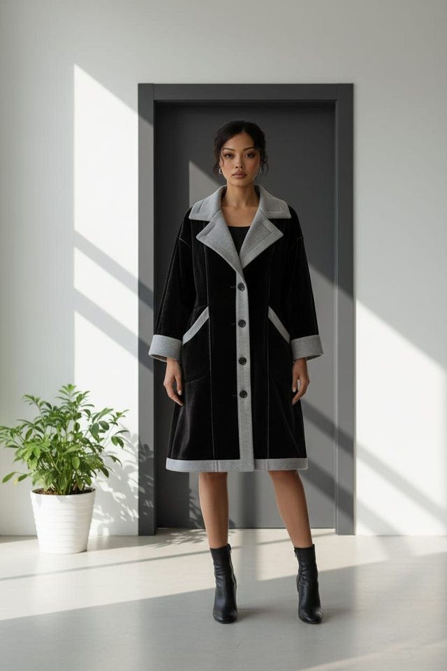 Schwarzer Samt mit weißem Revers, Taschen und Bündchen – markantes Kontrast-Design. Knöpfe und weite Ärmel als Highlights.​