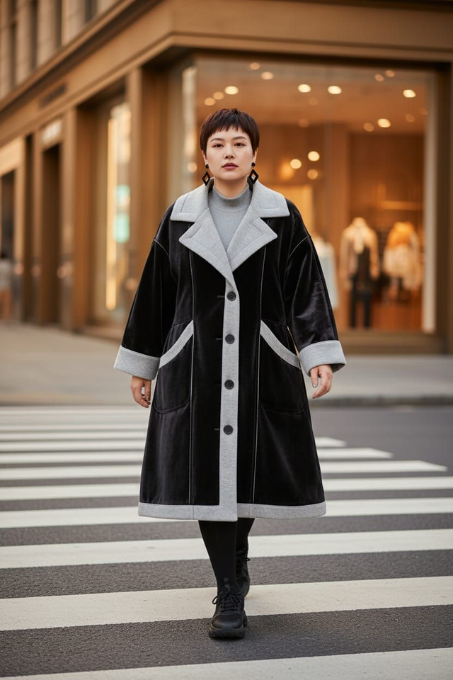 Dieser luxuriöse New Collection Mantel in samtiger Optik mit Schwarz-Grau-Kontrast verleiht deinem Outfit dramatischen Glamour. Die fließende Form und weiche Haptik schaffen cozy-elegantes Winter-Feeling – ideal für Streetstyle.​