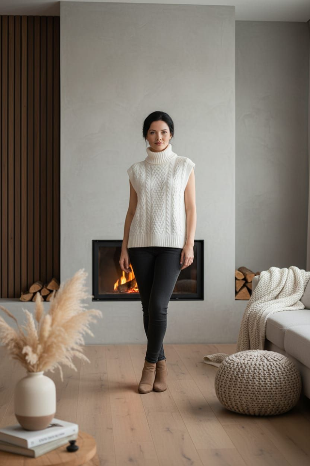 Dieser edle weiße Pollunder aus 10% Lammwolle, 40% Acryl, 30% Nylon und 20% Viskose besticht durch kunstvolles Zopfmuster. Der hohe Rollkragen schützt und wärmt elegant. Perfekt als Layering-Stück für Herbst und Winter.