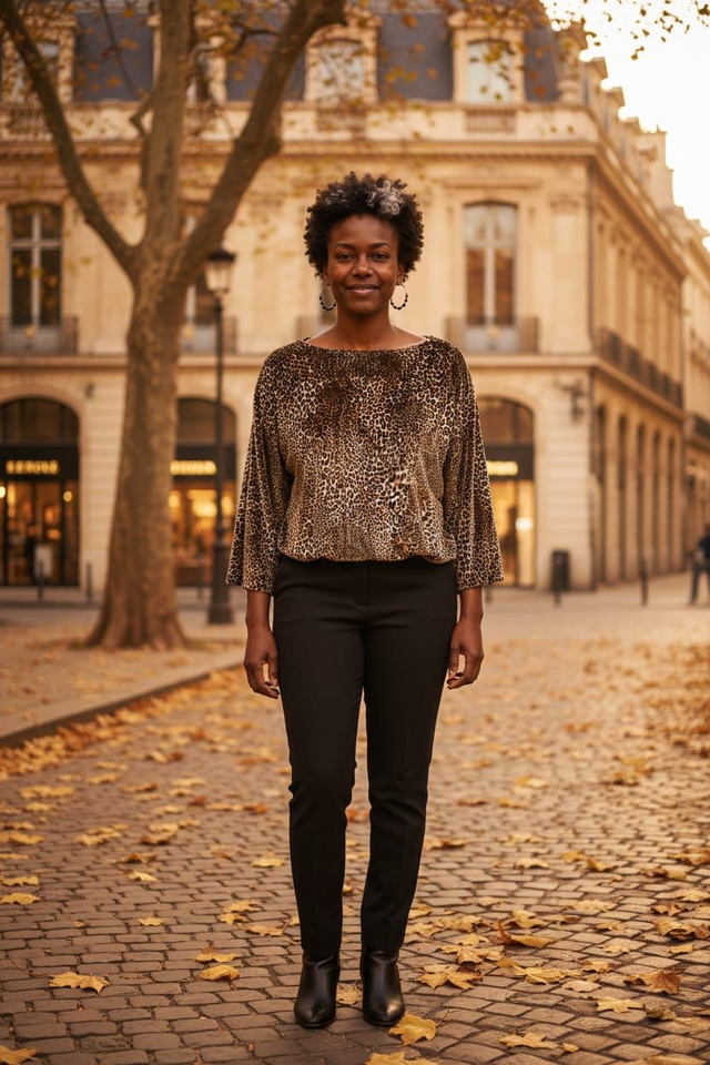 Leuchtender Leopard-Allover-Print mit fließendem Fall. Rundhalsausschnitt und leichte Transparenz für raffinierten Look.