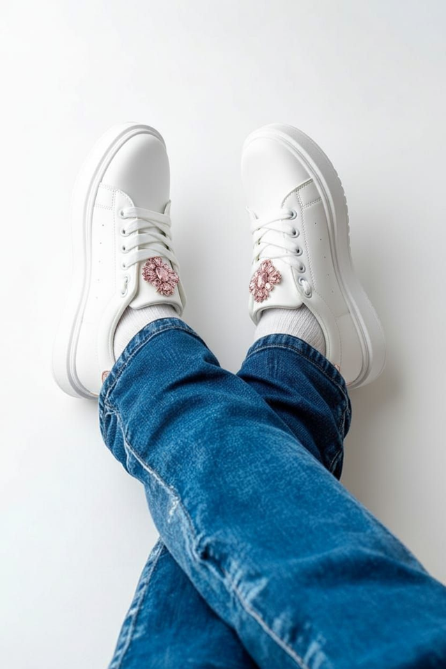 Diese glamourösen weißen Plattform-Sneakers mit rosa Herz-Rhinestone und pinken Akzenten mischen Sport mit Eleganz. Die dicke Sohle und der funkelnde Stein machen sie zum Hingucker. Ideal in Größe 40.​​