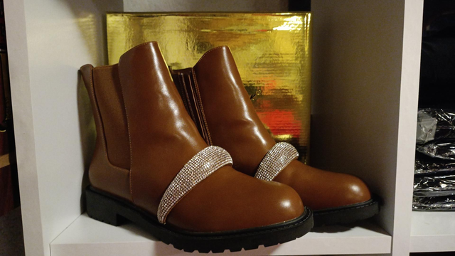 Diese glamouröse Stiefelette in edlem Braun mit breitem, diamantiertem Glitzerband ist ein echter Eye-Catcher. Der Chelsea-Schnitt mit elastischem Einsatz sitzt bequem. Perfekt für Herbst/Frühling-Outfits in Größe 40.