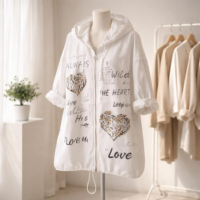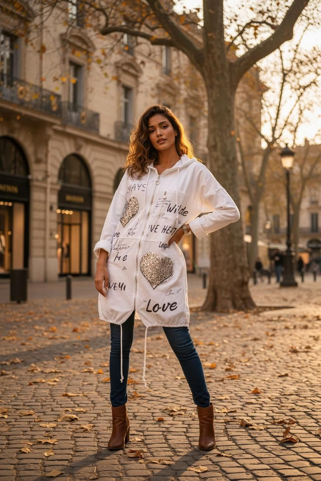 Die stylische weiße Hoodie-Jacke mit "Always Wild Love Heart"-Prints und glitzernden Herzen fängt boho-romantischen Spirit ein. Aus 100% Baumwolle gefertigt, mit verstellbarer Kordel-Kapuze, Reißverschluss und lockeren Ärmeln für entspannten Komfort.