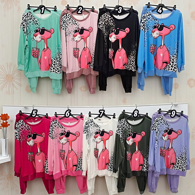 Dieser coole Tracksuit-Set mit verspieltem Pink-Panther-Print und Bubble-Tea-Motiv bringt lässigen Streetstyle mit Cartoon-Charme. Aus 95% Viskose und 5% Elasthan gefertigt, fühlt er sich weich, dehnbar und angenehm auf der Haut an. Perfekt für entspannte Tage zu Hause oder casual Outfits in Plus-Size.